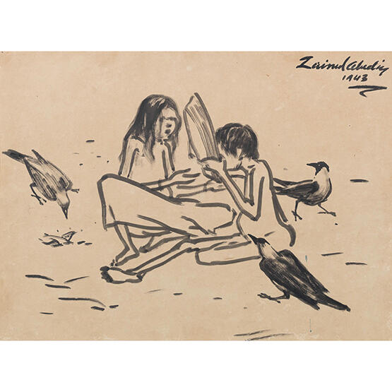 Born in East Bengal, Zainul Abedin (1914-1976) grew up with picturesque scenes from the Brahmaputra River basin and began his artistic career as an Impressionist landscape painter. He completed his degree from the Government College of Art in Calcutta in 1938 and became a lecturer at the college when he was 29. However, with the onset of the famine, Abedin left his job to document the sights surrounding him through his well-known famine sketches.The famine signaled a shift in Abedin's style, pivoting from that of academic painting to social realism. His work prior to the famine and during the famine poses a stark contrast against one another: his earlier works depict naturalistic pastoral scenes in Bengal, with gentle color washes in a European-influenced academic style, while his famine sketches, done with the cheapest paper and ink available, are visceral and undisguised in nature. Using choppy and angular brush strokes, the sketches explicitly depict famine scenes of suffering, pain, and desperation. Furthermore, the depictions of near-skeletal bodies alongside scavenger-class animals, the general lack of facial expressions, the disheveled nature of the subjects, coupled with a lack of spatial construction — similar to the lack of environment seen in Bhattacharya’s works — emphasize the dreadful nature of the famine.Eleven of Abedin’s famine sketches were selected for use in Ela Sen’s Darkening Days, creating an enriched visual and literary narrative about the famine for readers.As termed by scholar Nikhil Sarkar, all three artists — Chittaprosad Bhattacharya, Zainul Abedin, and Somnath Hore — continued to document “mass experiences” that occurred after the famine, including that of partition and other activism efforts. In Abedin's case, he continued incorporating motifs of toil and anguish in his work through works like Nabanna (1970) and Monpura'70 (1970), with both pieces acting as attempts to process long-term trauma.
