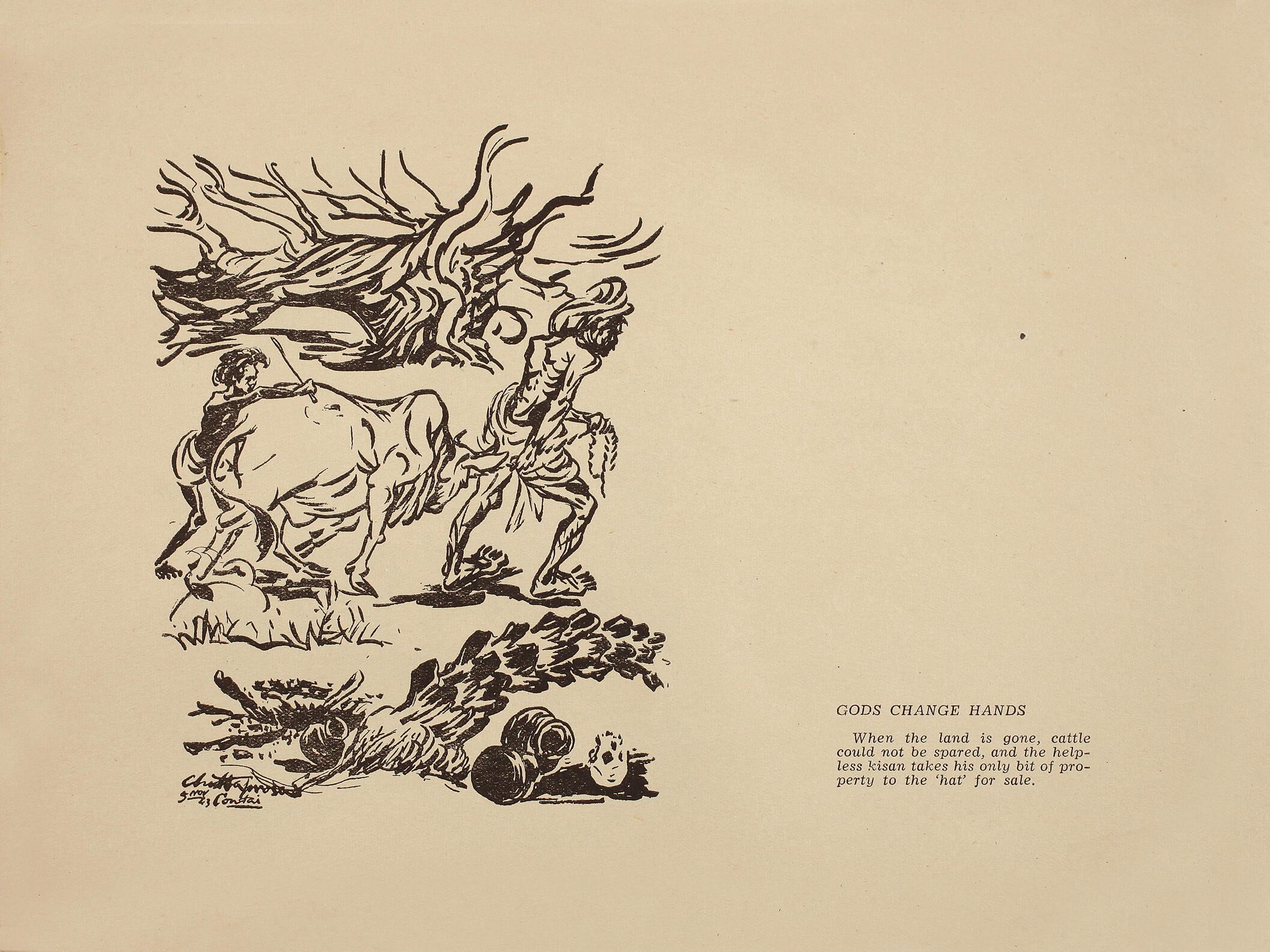 Similarly, Bhattacharya equips fluid ink-strokes in an expressionist-like style to depict an emaciated, struggling-yet-persisting body in transit and a sparse environment in profile view. In the foreground, coveted crops and a skull are visible. It could be argued that the inkwork in profile view is intended to anonymize the struggling subject, though snippets of text alongside the image contextualize the scene at hand. For example, the text reads, “GODS CHANGE HANDS: When the land is gone, cattle could not be spared, and the helpless kisan [agricultural peasant] takes his only bit of property to the ‘hat’ for sale.” Scholar Nikhil Sarkar notes that having faces and bodies turn away from the canvas risks erasing the identities and agency of the represented subjects, but the written component of Bhattacharya’s travel report allows him to document sights, smells, and inconveniences of the famine that cannot be documented through sight alone, grounding the experiences of the figures being captured on paper.