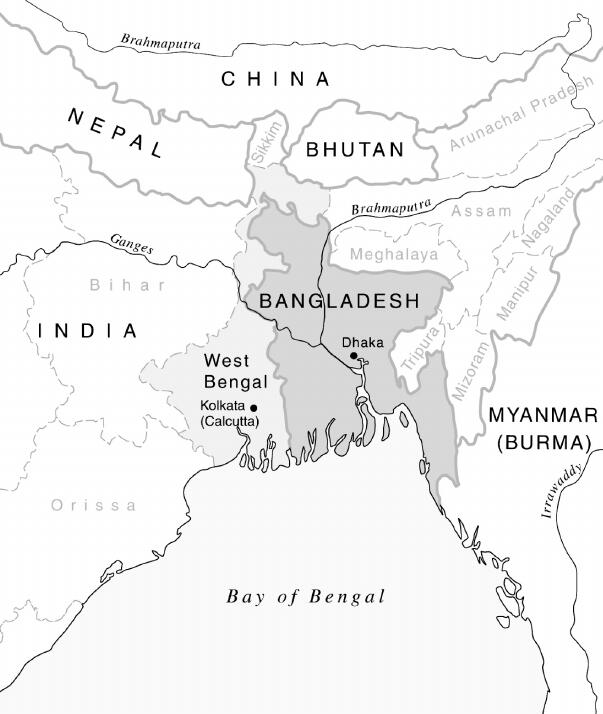 Left: Map depicting contemporary borders of West Bengal and Bangladesh, courtesy of Reece Jones.