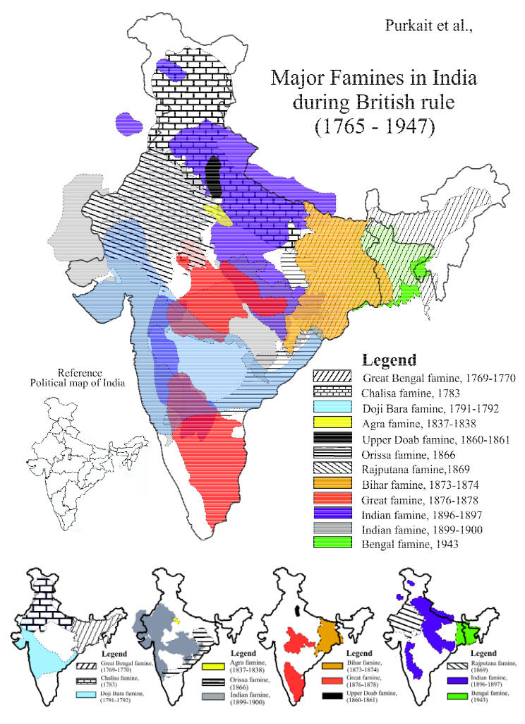 Right: Map depicting 12 (of 25) major famines during British rule, courtesy of Purkait et al.