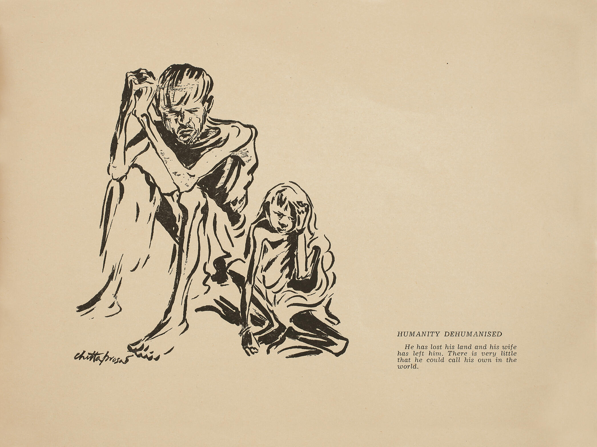 In viewing the sketch above, the sketch above uses a contour-heavy style to presumably depict an adult and a child, possibly father and child, in blank space, emphasizing their lack of worldly property and their focus on survival. The adult figure assumes a sitting position, hands clasped in beggar formation (or potentially in prayer, to plead with a higher being and ask for help) with a stern, broken expression on his face. The child, whose gaze is similarly jaded, is swallowed whole by cloth that surrounds them, further emphasizing the child’s poor health and stature. This sketch also includes text that reads, “HUMANITY DEHUMANISED: He has lost his land and his wife has left him. There is very little that he could call his own in the world.” The narrative depicted in these realist, black-and-white sketches are ones of desolation and loss; they are intended to alert viewers to typical famine scenes that would play out on streets and on land, as if to question the viewer’s own humanity and challenge the middle-class Bengali’s “repressive erasure” of the famine.