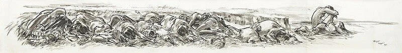 Born in East Bengal, Zainul Abedin (1914-1976) grew up with picturesque scenes from the Brahmaputra River basin and began his artistic career as an Impressionist landscape painter. He completed his degree from the Government College of Art in Calcutta in 1938 and became a lecturer at the college when he was 29. However, with the onset of the famine, Abedin left his job to document the sights surrounding him through his well-known famine sketches.The famine signaled a shift in Abedin's style, pivoting from that of academic painting to social realism. His work prior to the famine and during the famine poses a stark contrast against one another: his earlier works depict naturalistic pastoral scenes in Bengal, with gentle color washes in a European-influenced academic style, while his famine sketches, done with the cheapest paper and ink available, are visceral and undisguised in nature. Using choppy and angular brush strokes, the sketches explicitly depict famine scenes of suffering, pain, and desperation. Furthermore, the depictions of near-skeletal bodies alongside scavenger-class animals, the general lack of facial expressions, the disheveled nature of the subjects, coupled with a lack of spatial construction — similar to the lack of environment seen in Bhattacharya’s works — emphasize the dreadful nature of the famine.Eleven of Abedin’s famine sketches were selected for use in Ela Sen’s Darkening Days, creating an enriched visual and literary narrative about the famine for readers.As termed by scholar Nikhil Sarkar, all three artists — Chittaprosad Bhattacharya, Zainul Abedin, and Somnath Hore — continued to document “mass experiences” that occurred after the famine, including that of partition and other activism efforts. In Abedin's case, he continued incorporating motifs of toil and anguish in his work through works like Nabanna (1970) and Monpura'70 (1970), with both pieces acting as attempts to process long-term trauma.